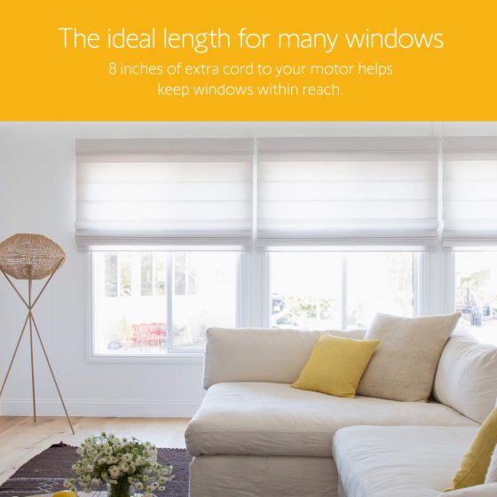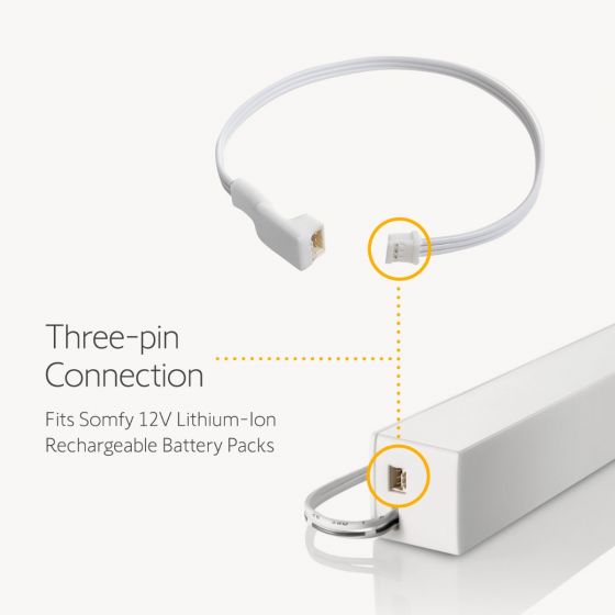 - Ekstra kabellengde gjør det lettere å lade Somfy 12V Lithium-Ion oppladbare batteripakker på plass, uten å fjerne dem fra monteringsbrakettene.